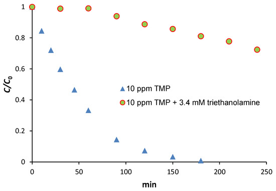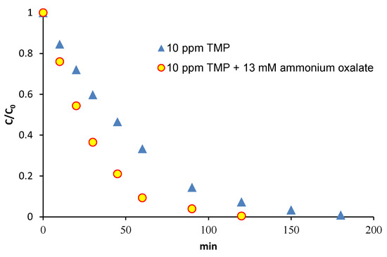 When ammonium oxalate was added (Figure 6), the degradation mechanism changed, resulting in an accelerated rate of degradation. It seems that superoxide radicals are not the mechanism of TMP degradation. It is possible that the pH increase caused by the addition of ammonium oxalate to the solution led to an increase in the degradation rate, as supported by a 33% increase in the degradation rate constant.
