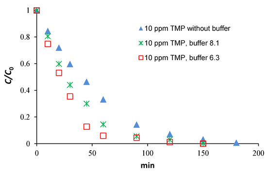 Figure 8 shows that the addition of buffers slightly increases the degradation rate of TMP. The total degradation of TMP can be expected in 2 h of irradiation with the addition of buffer 6.3.