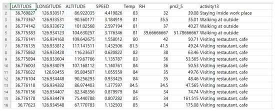 The dataset contains several environmental variables such as particulate matter 2.5 (PM2.5), temperature (Temp), relative humidity (RH), and informative data related to human trajectory. The data were sampled every 2 min. Further, we pre-defined activity patterns into 13 different categories: Commuting with a bus, Commuting with a car, Commuting with a subway, Commuting with a train, Commuting with an elevator, Home-BBQ, Pan-Frying, Home-SHS, Staying inside home, Staying inside work place, Staying outside, Visiting other commercial place, Visiting restaurant-café, and Walking at outside. A snapshot of the dataset is given in Figure 2.