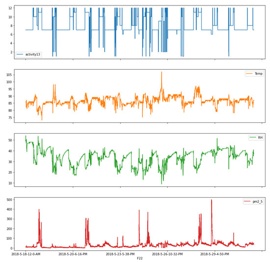 Four subject persons were given IDs, ID_01, ID_02, ID_03, and ID_04, respectively. Figure 3 shows the overall plots of the environmental and trajectory-related data for the ID_4 during the whole observation period as an example. The plots include profiles of activities and environmental information measured while the subject person is on the move. However, the location, altitude, and speed information of the subject is omitted to focus more on the relationship between the activity pattern and the environmental information. Each piece of data was plotted with respect to the observation time when it was collected, and the chosen data were used as features for the classifier to predict the activity pattern for the next observation time. Activity patterns are enumerated for the convenience of simulation and visualization as follows: Commuting with a bus as 1, Commuting with a car as 2, Commuting with a subway as 3, Commuting with a train as 4, Commuting with an elevator as 5, Home-BBQ Pan-Frying as 6, Home-SHS as 7, Staying inside home as 8, Staying inside work place as 9, Staying outside as 10, Visiting other commercial place as 11, Visiting restaurant-café as 12, and Walking at outside as 13.