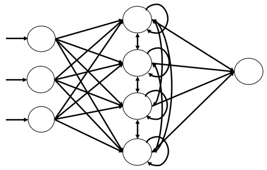Neural networks must have three properties to handle time-series data. First, it has to take features in an orderly fashion. Second, the length of the hidden layer has to be variable to handle variable lengths of data. Third, the model is capable of remembering the previous information, and can also use that at the time when it was requested. A recurrent neural network (RNN) is a network model that was invented to predict time-series data, satisfying the previous three properties. It has a structure that is similar to that of MLP, but nodes in the hidden layer have edges to other hidden layer nodes, as shown in Figure 6. These edges are called “recurrent edges”, which makes the network satisfy the three properties mentioned previously.