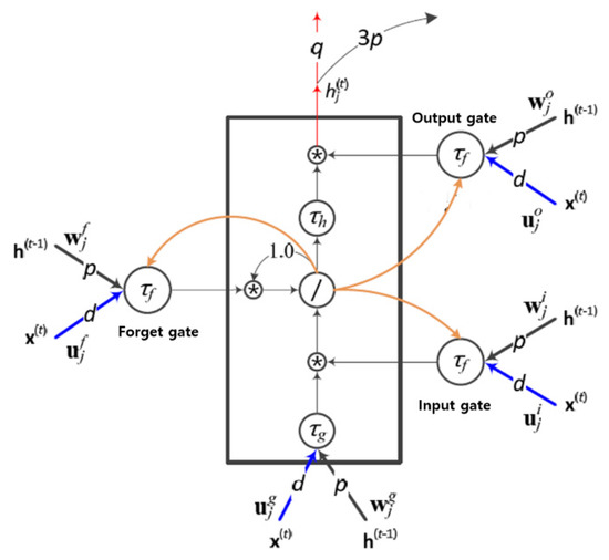 An LSTM memory block. This figure shows the jth memory block in a hidden layer. and represents input vectors at present state and previous hidden layer state, respectively. , , are the activation functions at the input, output, and the input and output gates, respectively. d, p, and q indicate the number of connections to the input nodes, hidden nodes, and output nodes, respectively. , , and are the weights for the recurrent edges connected to the inputs, input gates, and output gates, respectively. The symbols/and * refer to the linear activation function and multiplication respectively. In this figure, the biases are omitted for the simplicity of the diagram.