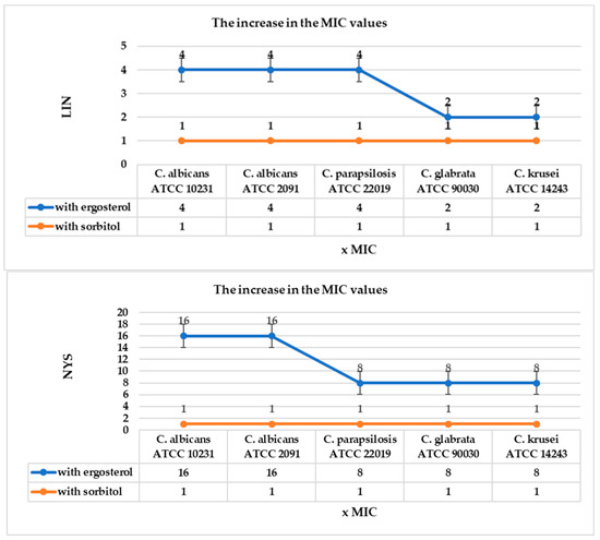 The increase in the MIC values (x MIC) of LIN and NYS in the presence of ergosterol and sorbitol toward selected reference Candida spp. strains.