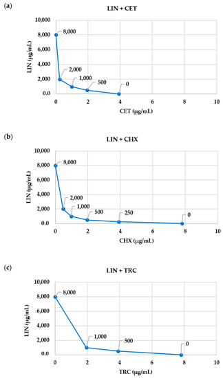 Moreover, the Mann–Whitney U test (Table 3) indicated statistically significant differences in MIC values for the synergistic combinations LIN and cetylpyridinium, LIN and chlorhexidine, and LIN and triclosan (p = 0.016 or p = 0.012, respectively).