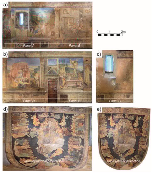 The wall paintings, the objects of this study, were produced by Saturnino Gatti and his workshop in a period between 1491 and 1494 [,] in the apsidal conch of St. Panfilo Church. The wall paintings in the lower part consist of five panels (labeled from A to E) displaying some moments of the Passion of Jesus, whereas on the vault are depicted God the Father along with the Angels and Blesseds in Paradise (Figure 1 and Figure 2).