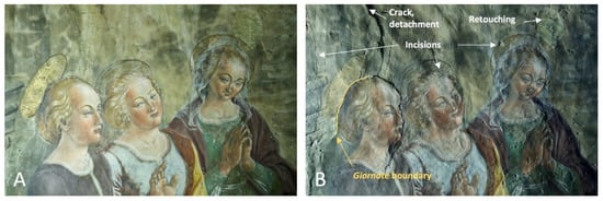 RAK photography is a useful and simple technique for examining works of art; it allows us to detect and document surface features, especially when we are looking for details that are not visible to the naked eye and are viewed in straight light (Figure 3). For paintings, RAK photography is used to obtain information about their state of conservation and use of preparatory techniques, to document, for instance, colour retouching and loss, as well as incisions, and to study the painting technique, as this can make clear the brushwork and layering of the paints []. Closer examination also reveals the junctions between giornate, i.e., the Italian term used to describe the amount of fresco painting that has been performed in a single day, and pontate (ponte, Italian for scaffolding), in which the plaster is laid in horizontal bands.