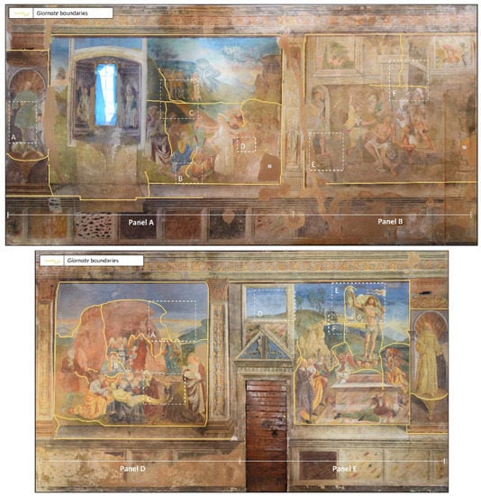Examination of the RAK photos revealed the presence of several damage effects. Significant fractures and degradation forms are evident on the entire painted surface; however, the decay forms display a more pronounced level in the different panels (panels A and B are in worse condition than the D and E panels) possibly imputable to the different environmental exposure, the position of the walls, and the presence of a window in panel A []. In addition, several signs of anthropic damage, especially in the form of surface scratches, are visible in the lower part of the paintings. The poor conditions of conservation necessitated restoration work and several dry retouchings over the centuries, which eventually hid some of the giornata boundaries, making their identification difficult in some cases.
