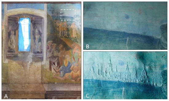 In panel A, the raking light highlighted the presence of graffiti (Figure 5B); examples of giornate and pontate boundaries are visible in Figure 5C, while colour losses and incisions can be observed in Figure 5B,D. Interestingly, in panel A, the raking light revealed the presence of a sort of landscape (Figure 6) depicting a monumental door and some religious buildings. The meaning and the origin of this detail remain unknown; we could assume a derivation from existing churches. Nevertheless, it was obviously covered by the blue sky in the background and can be classified as an example of rethinking.
