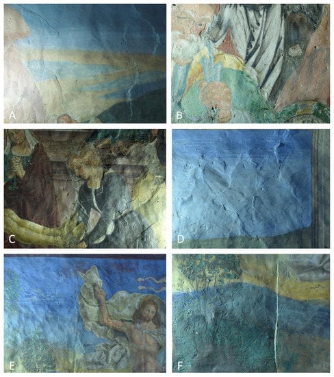 The chromatic alteration of the wall paintings is generally due to the concomitance of discoloration phenomena (bleaching), moisture trapping and surface deposits (Figure S2), as well as colour changes that are probably due to the transformation of azurite in malachite (Figure S2) [,]. In the map of the weathering forms (Figure 9), the whole painted surface is considered as a precaution.