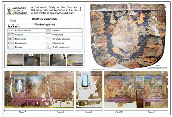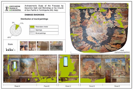 Lastly, as mentioned previously, this investigation represents a first digital documentation of the degradation phenomena affecting the Early Renaissance wall paintings realized by Saturnino Gatti during 1491–1494 in Tornimparte. The graphic contents here discussed, such as 3D photogrammetry (Figure 1 and Figure S1), raking light photography (Figure 3, Figure 5, Figure 6 and Figure 7) and damage mapping (Figure 8, Figure 9 and Figure 10) are able to illustrate the state of conservation of the monument before its restoration.