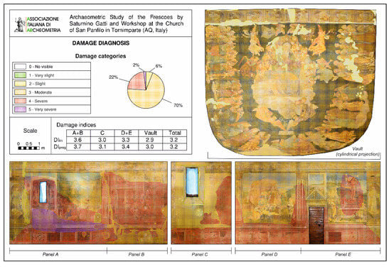 The five panels (labelled from A to E) and the vault of the apsidal conch were exported as orthomosaics from the 3D model and then imported into CAD software for semi-quantitative damage diagnosis based on a monument mapping procedure of materials, weathering forms and damage categories. The weathering forms and the six damage categories were described according to the literature [,,,,]. The linear damage index (DIlin) and the progressive damage index (DIprog) were estimated as follows: