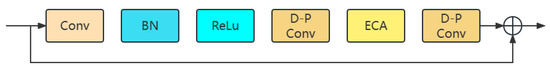 The improved network structure is shown in Figure 5 and Figure 6. The backbone of the network uses two bottleneck structures. The ECA module is added to Bottleneck1 but is not used in Bottleneck2. In both the bottleneck structures, depth-separable convolutions are used instead of traditional convolutions to reduce the number of parameters.