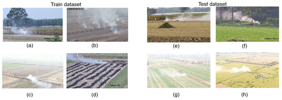 To enrich the dataset, we collected straw-burning smoke data in the summer under the background of immature crops and straw-burning smoke data in the autumn after the crops were mature and harvested. Due to the different colors of smoke burned by different crop straws, the smoke from wheat, maize, and rice straws were collected in this study. At the same time, considering the different backgrounds in different geographic environments, the experiment of collecting straw smoke data was arranged in different locations, including Hefei (Anhui Province), Luan (Anhui Province), Huainan (Anhui Province), Shangqiu (Henan Province), and Shenyang (Liaoning Province). Some pictures of training dataset and test dataset in different locations is shown in the Figure 8.