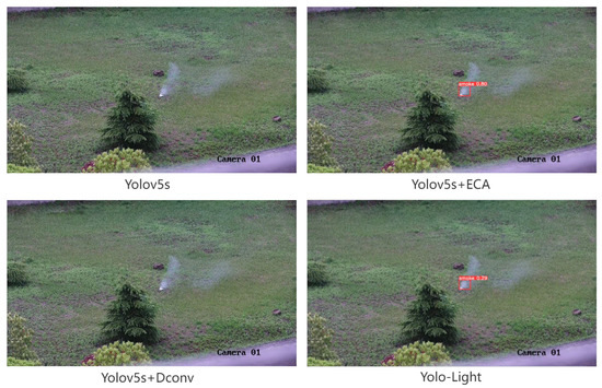 The scene in Figure 11 shows a green lawn smoke-detection scenario, which is not within the test range of the training set. The scene can be used to test the robustness of the smoke detection algorithm, which proves that the algorithm still has a stable detection ability in unfamiliar scenes. From the test results, we can see that both Yolov5s and Yolov5s+DConv failed to detect smoke. In this case, both Yolov5s+ECA and Yolo-Light could detect smoke correctly.