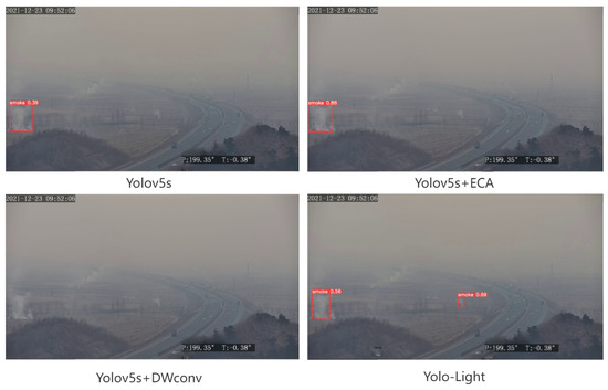 In Figure 12, haze is clearly visible in the scene and the visibility is low. In this case, the algorithm ignores the fuzzy smoke. As a result, both Yolov5s and Yolov5s+ECA were able to detect only one large area of smoke and they missed the smaller area of smoke on the right side of the image; however, Yolov5s+ECA had a higher degree of confidence than Yolov5s. Yolov5s+Dconv did not detect smoke due to computational problems. Yolo-Light successfully detected two smog patches and was unable to handle the blurrier smog in the image.