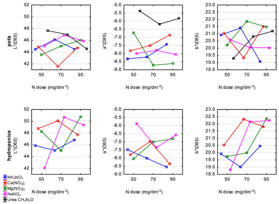 In hydroponic cultivation, the highest L* value (50.77) was determined in the flowering Chinese cabbage treated with Mg(NO3)2 at N-90. However, regardless of the N dose, the mean L* value was the highest after Ca(NO3)2 treatment (48.88). With an increase in the N level, the a* values increased for the samples treated with Mg(NO3)2 and decreased for the samples treated with NH4NO3. The highest a* value was reported after treatment with NaNO3 (mean a* value of −6.6). With regard to the b* colour coordinate, the values increased with an increase in the N dose using Mg(NO3)2 up to the highest level of 22.37. However, taking into account only the effect of the N source, the highest b* value was noted for Ca(NO3)2 (mean value of 21.56). As for the hue angle (h) and chroma (C) coordinates, there were fluctuations in the values depending on the N level and N source (Table S2).
