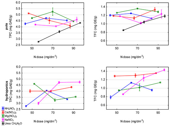 The highest antioxidant activity and phenolic content were obtained in the samples from the pot system treated with magnesium nitrate at high N doses (N-70 and N-90) as well as with ammonium and sodium nitrates at the N-90 dose. The results correlated with the level of nitrogen and the yield of the plant, which is similar to our previous findings [4]. In the hydroponic system, the highest DPPH activity was observed after the treatment with sodium nitrate at the N-70 and N-90 doses. Olarewaju et al. [55] concluded that the combined use of organic manure and a urea fertiliser led to enhanced antioxidant activity in three vegetables (Solanum macrocarpon L., Amaranthus viridis L. and Telfairia occidentalis f. Hooke). Urea application can also improve the growth, chlorophyll contents and antioxidant activity of ramie (Boehmeria nivea L.). Others [56] reported that the contents of hydrophilic antioxidant compounds (vitamin C and total phenols) as well as the antioxidant activity (DPPH and FRAP) in tomato (Solanum lycopersicum var. Sheva) increased as the dose of urea was decreased. This is in contrast to our results, in which the TPC and TFC values increased with an increasing urea N dose. However, at the same time, this is in agreement with our results on antioxidant activity, in which the TEAC radical scavenging activity of the samples in pot cultivation decreased significantly as the N level increased from N-50 to N-70.