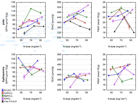 Different conclusions can be drawn from the results obtained in hydroponic cultivation as the maximum values of the DPPH and TEAC scavenging activity were 122.41 µmol/g DW and 409.51 µmol/g of DW, respectively, both after the NH4NO3 treatment. The highest FRAP was noted for Ca(NO3)2 at N-90 (24.12 mmol TE/g).