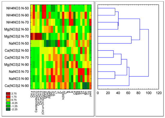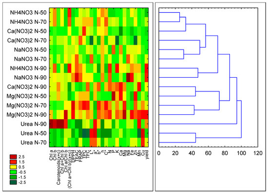 In the pot system, the first cluster consisted of the plants treated with urea at N-90 with high pigment contents (chlorophylls and carotenoids) and a high a* colour coordinate value. The second cluster consisted of the samples fertilised with magnesium nitrate at the N-70 and N-90 doses, showing high DPPH activity and b*, h and C colour parameters as well as N, Zn and Cu contents. The third cluster consisted of the plants fertilised with calcium nitrate at N-90 and magnesium nitrate at N-50, showing a high Ca content and high or moderate P and K contents. The samples treated with urea at N-90 showing high pigment contents (chlorophylls and carotenoids) and a high a* colour coordinate value were in the fourth cluster. The fifth cluster consisted of the samples with the N-90 dose of ammonium and sodium nitrates. Those plants had high DPPH and TEAC activity and high N content and yield. The samples fertilised with the N-50 and N-70 doses of ammonium, sodium and calcium nitrates, all with low levels of all the parameters tested, were in the sixth cluster.