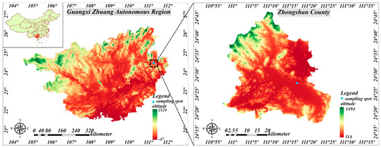 Location of study site and sampling spot—Zhongshan County, Guangxi Zhuang Autonomous Region, China. Map created using ArcGIS Pro 3.0.0 software (https://www.esri.com/zh-cn/arcgis/products/arcgis-pro/overview and accessed date at 20 March 2023).