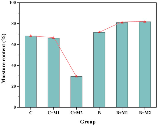 As one of the key indicators of plant growth, moisture content is measured and shown in Figure 2. Water is a key factor affecting the survival, growth and distribution of vegetation in terrestrial ecosystems. The water balance of the soil–plant–atmosphere continuum is a key mechanism for photosynthesis and plant growth. Therefore, monitoring the water content of plants is essential for studying plant growth. Comparing group C and group C+M1 in Figure 2, the results showed that the moisture content was 68.13% without adding material but decreased with little change to 66.13% after adding material 1. However, as shown in group C+M2 in Figure 2, the moisture content decreased significantly to 29.4% after the addition of material 2. It can be seen that material 2 had a devastating effect on the growth of Cynodon dactylon. For Bidentis pilosa, the moisture content was 71.59% without adding any materials, as shown in group B in Figure 2. The moisture content of plants increased slightly to 80.89% and 81.74%, respectively, after the addition of material 1 (group B+M1) and 2 (group B+M2). From the point of view of the moisture content alone, both materials 1 and 2 can promote the growth of Bidentis pilosa. In conclusion, adding materials can promote the growth of both plants.