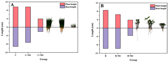 In Figure 4, the aboveground height and underground length of Cynodon dactylon (A) and Bidentis pilosa (B), respectively, were shown when different soil additives were introduced. As shown in group C of Figure 4A, when no material was added, the aboveground height and underground length of Cynodon dactylon were 9.63 cm and 9.17 cm, respectively. As shown in group C+M1 and C+M2 of Figure 4A, after adding material 1 and 2, the above two index parameters are 9.63 cm and 7.23 cm, and 3.93 cm and 2.1 cm, respectively. It can be seen that material 1 had no great influence on plant growth, but material 2 was extremely restrictive to it. The same conclusion was reached for Bidentis pilosa. Group B in Figure 4B indicated that the above-ground height of the plant was 8.52 cm, and the underground length was 9.73 cm when no material was added. As shown in group B+M1 and B+M2 of Figure 4B, when material 1 and 2 were added, the aboveground heights were 6.45 cm and 3.85 cm, and the underground length were 9.73 cm and 3.57 cm, respectively. Similarly, it was shown that material 1 had little effect on plant growth, but material 2 had a very adverse effect on plant growth. Therefore, it can be concluded that material 1 had more advantages than 2 in promoting phytoremediation.