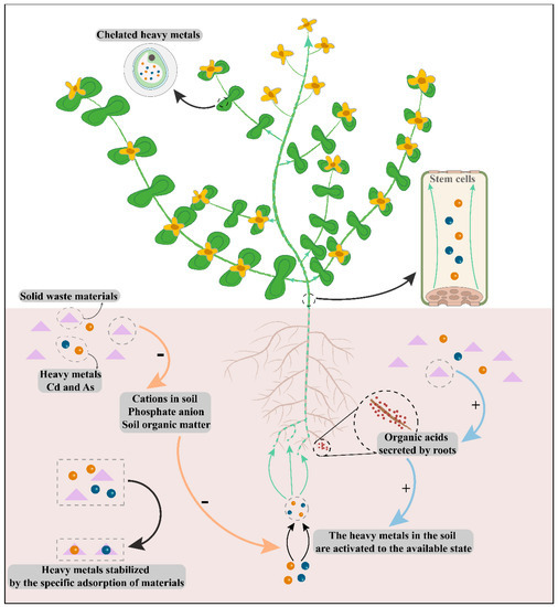 It has been recognized that heavy metal ions could be released and mobilized from contaminated soil under the facilitation of hyperaccumulators in the root–soil interface (defined as rhizosphere) [9,10]. Particularly, in the assistance of the phytoextraction process, for the soil contaminated by Cd and As, the mobile Cd and As fractions in the rhizosphere were much greater than those in bulk soils [11,12]. In this case, if solidifying material was involved, it could be reasonably hypothesized that the content of Cd and As of bioavailable state in soil could be reduced dramatically by using phytoextraction remediation technology assisted by materials [13,14,15]. In addition, solidified materials can promote the secretion of organic acids by plant roots, which can transform heavy metals in soil into bioavailable heavy metals and then be absorbed and utilized by plants. Some attempts have been made. Sun et al. [16] added hydroxyapatite and giant fungus to repair the farmland polluted by Cu and Cd, reducing the content of effective copper by 72.43% and the content of effective cadmium by 48.24%. Zhang et al. [17] studied the remediation effect of Cd in wheat weakly alkaline soil using zeolite, diatomaceous earth and sodium-based bentonite as the main remediation components, supplemented by calcium dihydrogen phosphate and fulvic acid. Field experiments showed that Cd concentrations in rhizosphere and non-rhizosphere soils decreased by 27.3–31.2% and 34.3–54.2%, respectively.