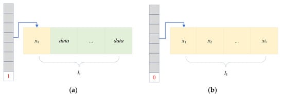 Figure 3 illustrates the FMLE strategy. Figure 3a,b show how the AHBs for types of BT1 and BT2 are processed under the strategy. Below, blocks of type BT1 will be elaborated as the example. In Section 3.1, x1 in the block is LSB marked to obtain the marked block (see the left part in the sub-figure). Figure 3a gives the strategy of the first AHB. To consider decryption recovery at the receiver, it is necessary to embed m and n. The strategy adopted by other AHBs is shown in Figure 3b. Then, the encrypted block (see the middle part of the sub-figure) is obtained by encryption in Section 3.2. The encrypted image block loses relevance, and the LSB mark is covered. Therefore, during data embedding, the two location maps, Map1 and Map2, and the hiding key are used to guide secret data embedding. If the value in the location map is 1, the block belongs to the AHB, otherwise, it belongs to the UHB. Meanwhile, the value is embedded in the MSB position in x2 of the block with 1 bit in each block. In this paper, x1 is the reference pixel and plays an essential role in the cover recovery phase, so it cannot be used for data embedding.