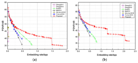 Table 5 shows other metrics comparisons of the proposed scheme with the related works. Column 2 gives a comparison of the separability of each scheme. Among them, schemes [14,15,16,30] adopted the joint method at the receiver, but the other schemes adopted the separable method to achieve more flexibility. During the data recovery extraction phase, the data accuracy cannot be fully guaranteed in [14,15,16], and the recovered image is lossy. However, the data can be extracted accurately in [17]. The common point of [14,15,16,17] is that the scheme can realize the lossless recovery of the cover image only if the block size satisfies certain embedding conditions. Compared with the above schemes, the data-error-free extraction and the cover image lossless recovery can be guaranteed in the rest schemes and the proposed scheme.