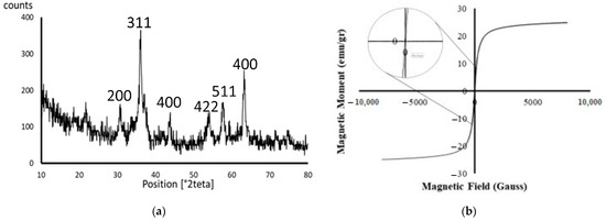 The AGFM curve of EgLiCl-mGO is presented in Figure 2b. The amount of ±25 electromagnetic units (emu g−1) is helpful for the rapid gathering of the adsorbent in the sample solution [27]. The remanent magnetization is almost zero, confirming the superparamagnetic property and the presence of Fe3O4 nanoparticles.