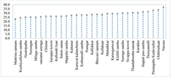 The thirty traditional varieties (Figure 1) used in this research and a legal permission letter for the collection of plant material by adhering to institutional, national, and international guidelines and legislation were obtained from the Director of Research of the Tamil Nadu Agricultural University, Coimbatore, Tamil Nadu. Of the 30 varieties, 14 were white in color, 15 were red, and 1 black variety was found. Seeds were obtained from the local farmers of the Cauvery Delta Region of Tamil Nadu, India, from July to December 2020 and were harvested manually and stored at 12% moisture. Every single grain was carefully cleaned by hand, with any unnecessary materials such as stones, hay, and dirt being removed. Experiments for this study were conducted at the Laboratory of Centre of Excellence in Soil Health, Anbil Dharmalingam Agricultural College and Research Institute Campus, Trichy, in January 2021.