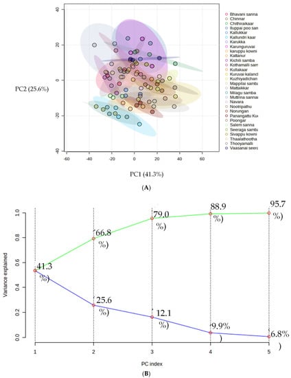 (A) PCA of thirty traditional rice varieties—Score plot of PCA. (B) Scree plot of PCA.