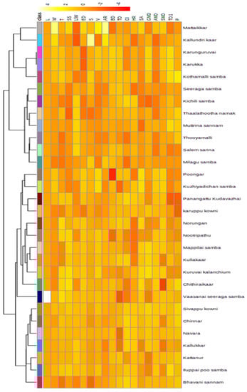 Heat map and cluster analysis representing the changes in physical and engineering properties of thirty traditional rice varieties. Each rice sample is shown as a single column in the heatmap, and each property is shown as a single row. Different shades represent property value, whereas red color represents the trend of decrease and yellow represents a rising trend (color key scale on the right of heatmap).