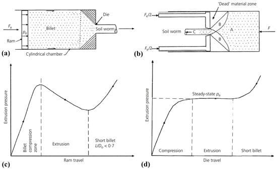 Schematic diagram of extrusion approaches ((a) direct extrusion, (b) reverse extrusion) and the characteristic extrusion pressure against ram/die displacement trace ((c) direct extrusion, (d) reverse extrusion) (after O’Kelly []). Note: Do, billet diameter; Fe, ram/die force; L, initial billet length; pe, extrusion pressure.