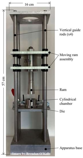 Fitzjohn and Worral [] performed extrusion tests on brick clays, measuring their extrusion rates as a function of the applied extrusion pressure (pe) for different clay contents. Subsequently, CERAM Research [,] developed a ceramic rheology tester, termed the Martin flow instrument (MFI), which is a modified version of the melt flow indexer used for testing the flow properties of plastics and polymers. For the MFI, a standard length of cored soil sample is inserted into a cylindrical barrel that contains a die at the base. A piston placed inside the barrel applies pressure via a deadweight load to cause the extrusion of the soil to occur through the die orifice. The time period required for a known soil volume to flow through the die orifice is measured, with the flow time (extrusion rate) dependent on the soil toughness, with tougher materials taking longer []. The soil sample, from soft earthenware clays to some advanced ceramic materials, is tested within a preferred shear rate range (relevant to the subsequent processing of the material) by employing an appropriate deadweight in the range of 2–30 kg applied to the piston [].