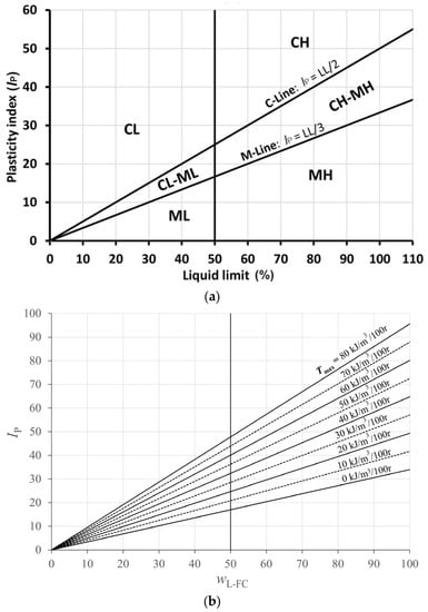 Based on fundamental experimental observations described in the previous section and directly connecting plasticity with toughness, Moreno-Maroto and Alonso-Azcárate [] proposed an updated soil plasticity classification method in which the determining factor is toughness. For measured wL-FC and IP, the soil is non-plastic for IP/wL-FC < 0.2 and low plastic for 0.2 ≤ IP/wL-FC ≤ 0.33 (i.e., silt, organic soil, sandy soil, etc., with computed Tmax of ~ 0 kJ/m3/100 r). Soil with a low or moderate influence of clay minerals (i.e., clayey silt, sandy clay, etc., whose Tmax < 20 kJ/m3/100 r) has 0.33 < IP/wL-FC < 0.5, while clay (i.e., plastic soil with Tmax ≥ 20 kJ/m3/100 r) has IP/wL-FC ≥ 0.5 []. The developed soil classification chart of Moreno-Maroto and Alonso-Azcárate [] is presented in Figure 7a. Moreno-Maroto et al. [] investigated the correctness of soil classifications assigned to 31 different inorganic fine-grained soils by applying six of the main plasticity-based soil classification proposals (charts), including the Moreno-Maroto and Alonso-Azcárate [] and Casagrande plasticity charts, with their research results ranking the Moreno-Maroto and Alonso-Azcárate [] chart (Figure 7a) as having the strongest predictive capacity among the examined proposals.