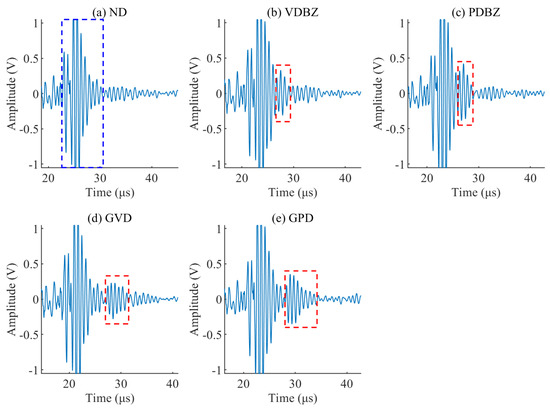 Ultrasonic signals of five types of defects (blue dashed line represents the blind zone signal, and red dashed line represents the defect signal).