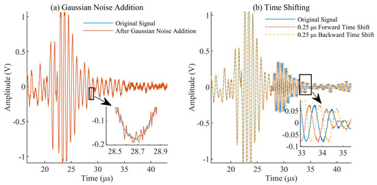Because of uneven proportion in the amount of each type of defect signal, the original dataset was enhanced by time shifting and adding white Gaussian noise. Each type of signal was expanded to 200. Physically, time-shifting refers to the change in the distance between the transducer chip and the defect, while white Gaussian noise represents the electrical noise of the circuit during signal transmission [24]. Gaussian noise addition is a feasible method for enhancing all five types of defect signals: data enhancement mainly relies on this method. Segmenting defect signals in blind zones is challenging, and thus the time shifting method is only suitable for general defects. Additionally, as the initial wave pulse in the signal often contains a region consisting solely of electrical noise, the noise signals are randomly selected and added to the tail of the signals during the data enhancement process. This technique provides a similar enhancing effect to the time shifting method. During the actual operation process, we found that it was not easy to evaluate the accuracy performance of the model on large datasets. Therefore, the decision was made to expand the number of each signal type to 200. The number of signals for each weld defect is presented in Table 1. Figure 1 illustrates the different types of defect signals that were considered, while Figure 2 showcases the impact of applying white Gaussian noise addition and time shifting techniques to the signal.