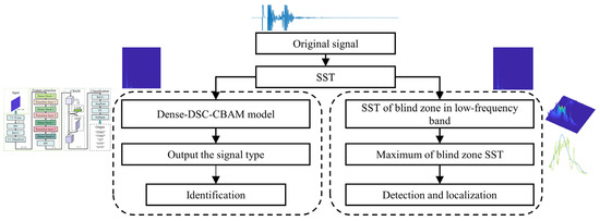 Figure 3 depicts the proposed method’s flowchart. Firstly, the signal undergoes SST to obtain precise time-frequency distribution results. The method then proceeds in two parts—the signal detection section and the signal identification section. During the signal detection section, the algorithm analyses blind zone areas in the low-frequency band of the time-frequency results, and determines the location of defects based on the maximum value of the SST transformation results. In the signal identification section, the trained defect identification model analyzes the time-frequency map without requiring manual feature extraction. The model outputs the presence of defects and identifies their type based on the trained parameters.