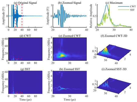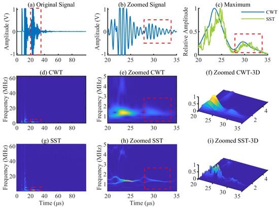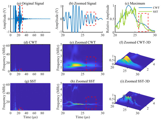 CWT and SST results of the PDBZ signal and zoomed view of the defect area: (a) original signal; (b) zoomed signal of the defect area; (c) maximum curves of the defect area after CWT and SST; (d) CWT of the signal; (e) zoomed CWT of the defect area; (f) zoomed CWT-3D of the defect area; (g) SST of the signal; (h) zoomed SST of the defect area; and (i) zoomed SST-3D of the defect area.