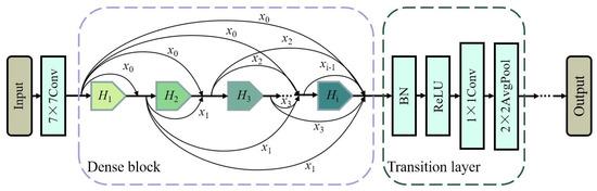 The DenseNet architecture comprises two core structures: the dense block and the transition layer. Each dense block contains several dense layers, where the input of each layer comprises the output feature maps of all preceding layers. Within the same dense block, the feature layer’s height and width remain constant, and the number of channels is increased according to the designated growth rate. The output feature maps of the i-th dense layer are: