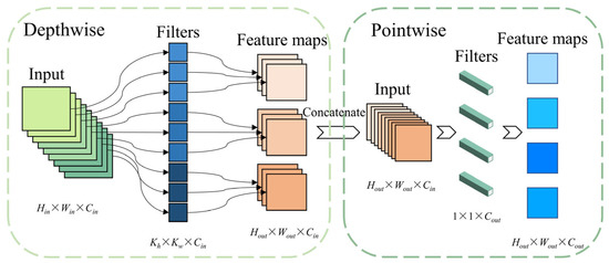 Assuming that the input feature map’s dimension is Hin × Win × Cin and the output feature map’s dimension is Hout × Wout × Cout, ordinary convolution has a kernel size of Kh × Kw and Cout output feature maps. If each feature map’s point is convolved once, a single convolution kernel’s calculation amount is Hin × Win × Kh × Kw × Cin. The total computation for Cout convolution kernels is Hin × Win × Kh × Kw × Cin × Cout. In comparison, DSC employs Cin convolution kernels with a kernel size of Kh × Kw in depthwise convolution, where each kernel convolves only one feature map, resulting in a calculation amount of Hin × Win × Kh × Kw × Cin. The pointwise convolution, on the other hand, employs Cout convolution kernels with a kernel size of 1 × 1 × Cin, resulting in a calculation amount of Hout × Wout × 1 × 1 × Cin × Cout. Consequently, the total computation amount for DSC is Hin × Win × Kh × Kw × Cin + Hout × Wout × Cin × Cout. If the input and output feature maps have the same width and height, a simplified ratio of DSC to ordinary convolution is