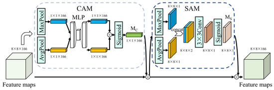 As illustrated in Figure 11, the CAM module is responsible for attention weight on the feature channel, while SAM is responsible for attention weight on the feature space. In the CAM module, the input feature map (8 × 8 × 166) is subjected to maximum and average pooling to obtain two 1 × 1 × 166 feature maps. These feature maps are subsequently input into a two-layer Multilayer Perceptron (MLP) to add and multiply each element. After activating the sigmoid function, the channel attention weight MC is obtained, which changes the weight of each channel. The channel attention weight is multiplied by the input feature map to obtain the input of the SAM module.