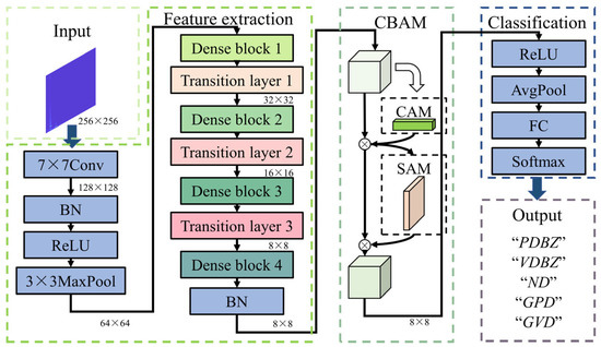The present study utilized a convolutional neural network designed in Pytorch. The network’s input layer accepts an RGB three-channel signal SST diagram with an input pixel size of 256 × 256. Shallow feature extraction involves the application of a 7 × 7 convolution layer and a 3 × 3 maximum pooling layer, resulting in feature maps with 64 channels (64 × 64 × 64) and a reduction in input image dimensions. To enhance the extraction of image information and improve the reusability of features, the DenseNet structure was employed, consisting of four dense block modules and three transition layer modules. The number of dense layers in each of the four dense blocks was 3, 6, 8, and 4, respectively. The dense layer utilized single-point convolution and DSC for feature extraction with a growth rate of 16, leading to the output of 16-channel feature maps per dense layer. The transition layer performs channel dimensionality reduction with a compression ratio of 0.5. This implies that the number of channels transmitted into the next dense block is half of the input, resulting in a change in feature map size from 64 × 64 to 32 × 32, 16 × 16, and 8 × 8, through three layers. To reinforce the feature extraction component’s channel and space attention, CBAM is incorporated before they are sent to the classification network, which consists of the activation function, global average pooling, and full connection processing. The softmax function is employed to determine the probabilities of an image belonging to a specific defect type with the number of nodes in the output layer equaling the number of possible defects for classification.