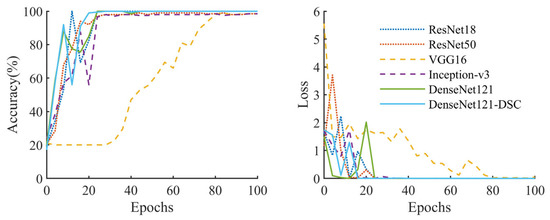 To evaluate the potential impact of replacing the 3 × 3 convolution kernel with DSC on the performance of network models, we trained ResNet18, ResNet50 [48], VGG16 [49], Inception-v3 [50], DenseNet121 [31], and DenseNet121 using DSC under the same dataset and experimental setup. The values of accuracy and loss on the testing dataset were recorded after each iteration of each model during the training process, as shown in Figure 14.