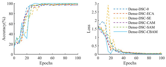 After conducting numerous experiments, it was determined that constructing Dense-DSC-0 with four dense blocks, each containing 3, 6, 8, and 4 dense layers, provides optimal results. To minimize the impact of model modification, an attention module was added before the classification network of Dense-DSC-0. The effects of five attention mechanisms: efficient channel attention (ECA) [51], squeeze and extraction (SE) [52], CAM, SAM, and CBAM, and additionally, three lightweight models: SqueezeNet [53], ShuffleNet-v2 [54], and MobileNet-v3-small [55], were compared. Figure 15 shows the accuracy and loss curve of the testing dataset after each iteration of the model with different attention mechanisms during the training process. As the performances of the lightweight models were significantly weaker than that of the model with an attention mechanism, they are not shown in Figure 15.
