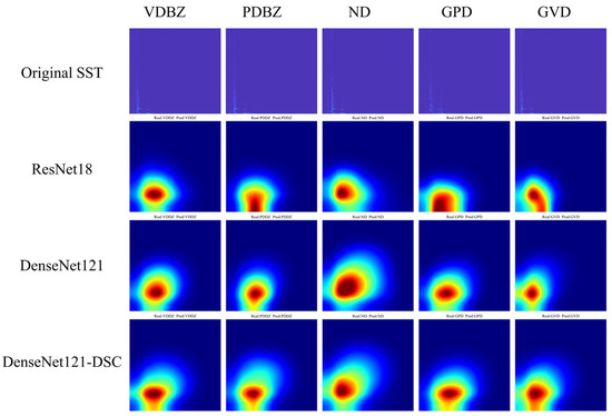 One of the primary reasons why machine learning, especially deep learning, has not gained widespread trust is due to the fact that the inner workings of the model are often deemed an “invisible black box.” To address this concern, researchers have proposed a range of class activation mapping methods to analyze the decision-making criteria of the model. In this paper, the gradient-weighted class activation mapping (Grad-CAM) [56] method is employed to visually compare multiple models. Specifically, five samples from each category are randomly selected from the testing dataset and input into the model. The feature information after the last convolution is visualized. The darker the color of the red area within the activation map, the more important that area is deemed for decision-making. Firstly, we focus on visualizing the DenseNet121-DSC model, which is compared to ResNet18 and DenseNet121: two commonly used models with the best performance. Figure 16 shows the comparison.