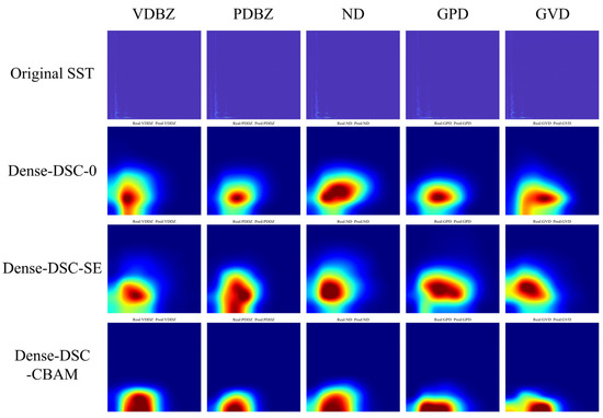 Figure 17 reveals that the focus areas for Dense-DSC-0 and Dense-DSC-SE are similar to that of DenseNet121. While the area of the blind zone signal and defect signal is also observed, they are depicted only in yellow and green with the overall red area leaning towards the upper right. Notably, the focus area for Dense-DSC-CBAM lies close to the lower boundary, signifying its emphasis on low-frequency regions. The red range encompasses the entire area from the blind zone signal to the defect signal outside the blind zone. Furthermore, the yellow-green transition area for Dense-DSC-CBAM is narrower than that seen in other models, which highlights the effectiveness of the CBAM module in enhancing the model’s focus on critical time-frequency feature information of SST and refining the model’s focus area.
