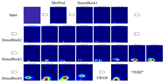 As can be seen from Figure 18, the shallow convolution layer for feature extraction is focused on the key information of low-frequency positions. With the continuous backward transmission of features, the focus area of the convolution layer of the third dense block gradually expands. As for the fourth dense block, its focus area has deviated from the feature area containing critical information about the defect signal, which is due to the feature reusability of the DenseNet structure. However, the CBAM module redistributes the weight of space and channels, returning the focus area of the entire model to true key feature areas.