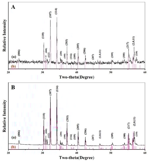 (A) Unprocessed XRD spectrum. (B) XRD spectra processed with Rietveld refinement. (a) XRD spectrum of La0.75Ba0.25Fe12O19 powders, which were sintered at 1400 °C for 3 h and subsequently annealed in an O2 atmosphere at 800 °C for 15 h in 3 steps, and (b) standard XRD spectrum of the BaFe12O19 (PDF#84-0757) in discrete red lines.